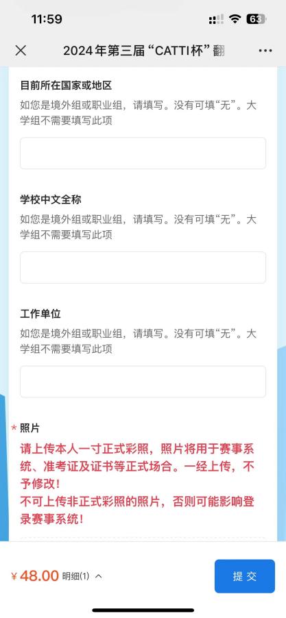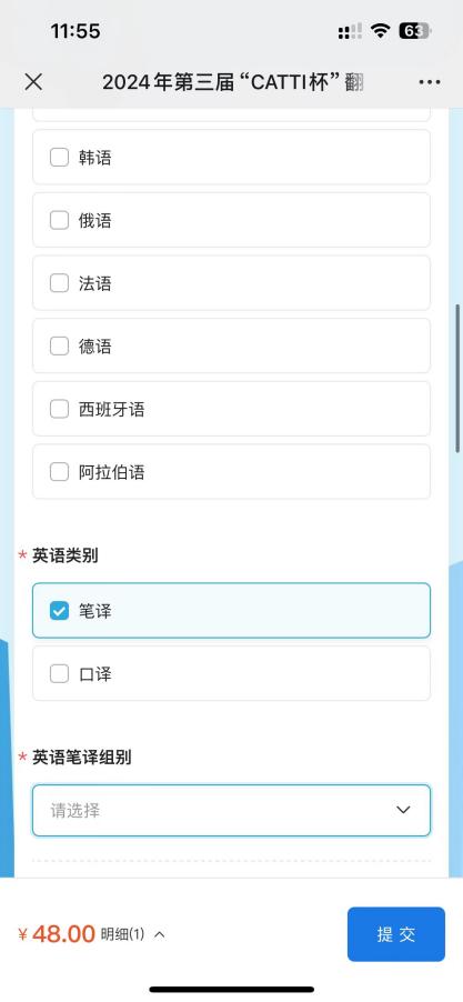 信息如实填写完毕后,可点击页面下方“提交”并缴费(可根据个人经济情况选择是否获取备赛资料,翻译教研室亦会免费提供电子版备赛资料哦)。
