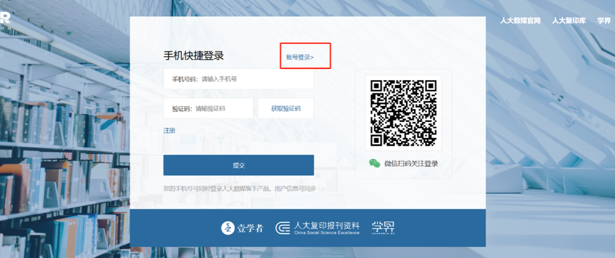 点击进入用户中心,选择账号登录。输入账号密码,登录后即可使用本数据库。