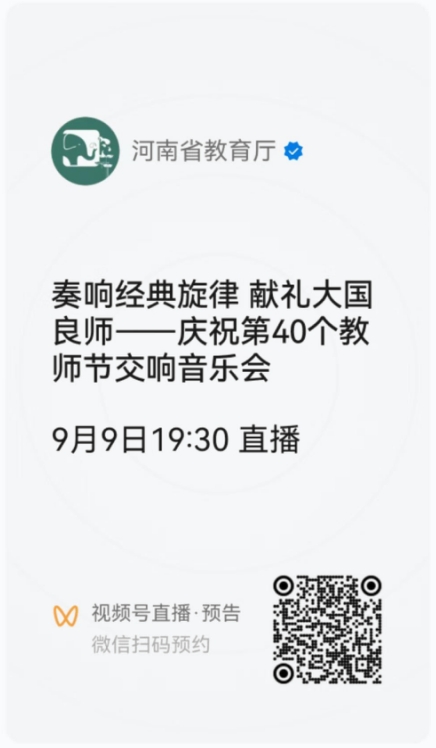 2.线上收看:请各地、各校采取适当方式通知广大教师、教育工作者、学生及学生家长。观众请微信扫码关注“河南省教育厅视频号”,点击“预约”,届时可直接收看直播。