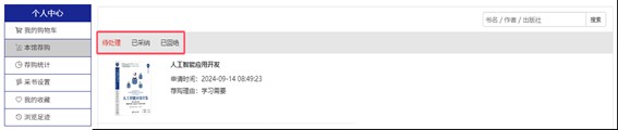 6、我的荐购:【个人中心】→【我的荐购】 中可查看到所有的荐购书目,及图书馆的采纳情况。