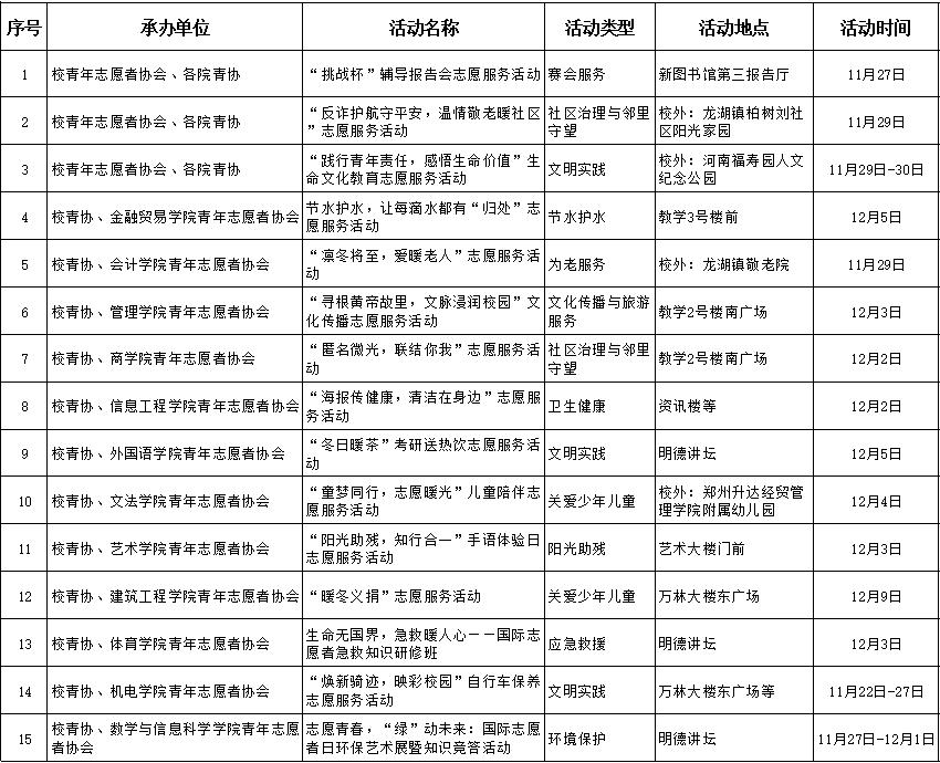 1.高度重视,精心组织。各学院团委(团总支)需加强组织领导和活动指导,把活动安全摆在首位,将“12·5国际志愿者日”系列活动作为深化实践育人理念、推进校园文明建设的重要载体和重要抓手,精心设计方案,周密安排部署,认真组织实施。