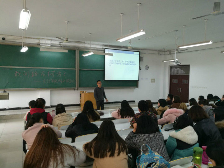 为了让同学们对社会的就业及创业现状有更深入的了解,对未来的职业道路有更清晰的认识,我院于20171228日,在时金楼-216开展题为“敢问路在何方”的创业报告会。本次会议由会计学院行政秘书刘锦老师主持召开,社会成功人士李樊总经理现身讲授,另有近二百名15级学生代表参与交流。