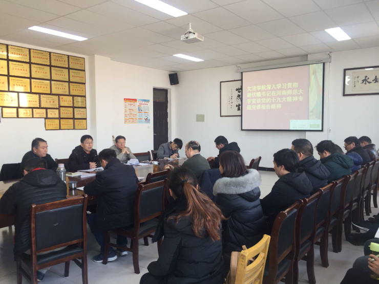 12月21日下午,文法学院在院会议室召开深入学习贯彻谢伏瞻书记在河南师范大学宣讲党的十九大精神专题党课报告精神会议。会议由学院党总支杨明志书记主持,全体教职工出席。