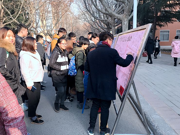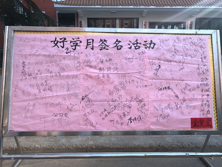 2017年12月26日上午10时,金融贸易学院于三号楼前开展“好学月”签名活动。此次活动的目的在于促进我院学生养成良好的学习习惯、明确学习目的、深化学习意识、树立正确的学习态度,为自己未来的学习打下坚实的基础。