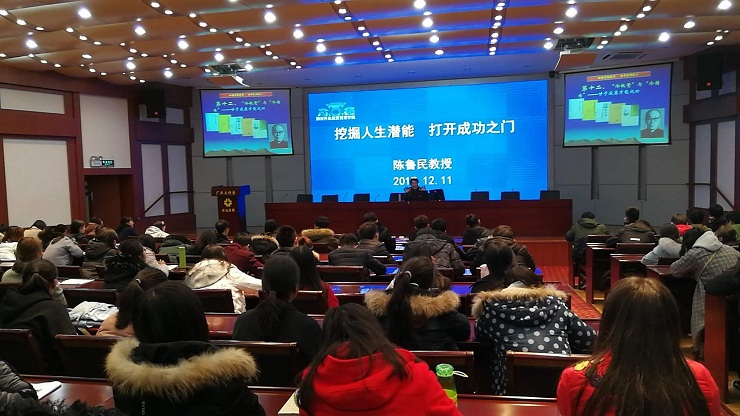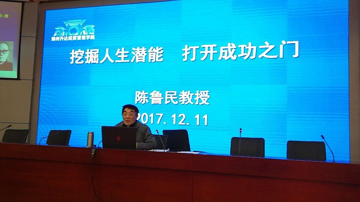 12月11日19:00时,中国作家协会成员、郑州市作协副主席、思政部教师陈鲁民教授在国际会议厅举行了一场生动的报告会。学校百余名学生代表到场聆听。陈鲁民教授围绕着“挖掘人生潜能、打开成功之门”这一主题从十二个方面讲解了大学生如何认识职业选择与品德修养、实践与信念、面对挫折与逆境、人生态度与人际关系等问题。