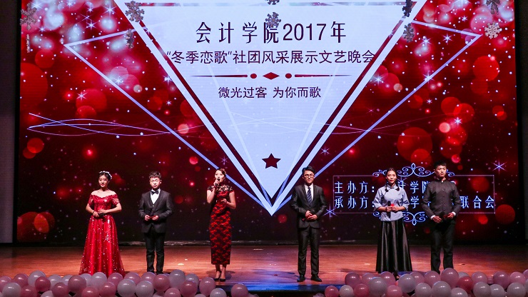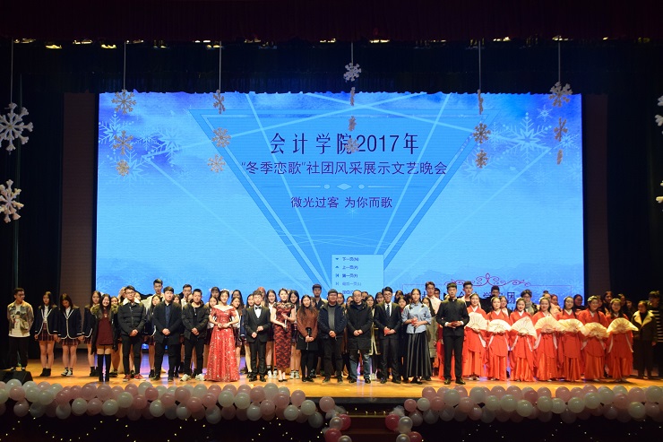为了丰富校园文化,展示丰富多彩的大学生活,使同学们能够深入了解乐观向上的社团精神。12月14日晚上6.30,由会计学院团委主办,会计学院社团联合会承办的会计学院2017年“冬季恋歌”社团风采展示文艺晚会在思源会馆隆重上演。