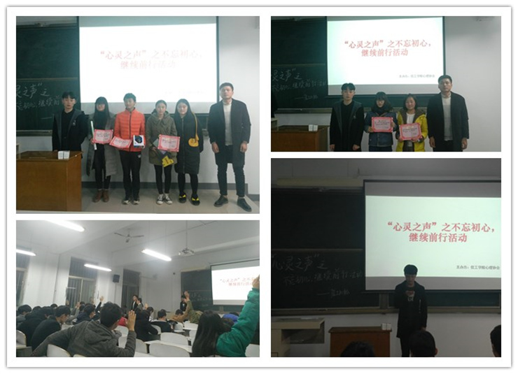 在学校心理健康教育中心的指导下,12月6日,由信工学院主办的“心灵之声”之不忘初心,继续前行主题活动在自勉堂111教室圆满举行。信工学院各班参选同学依次上台分享自己关于不忘初心,继续前行的奋斗故事。不同的是故事,相同的是同学们不忘初心,努力拼搏的奋斗精神。