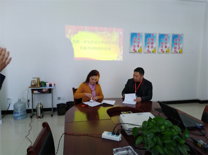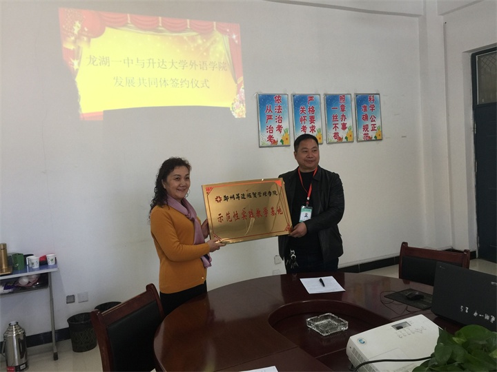 张梦院长介绍了我院的师资、专业、实验室的基本情况,特别介绍了我院英语师范方向及日语方面具有较强的文化底蕴,双方就英语、日语学生的实习工作达成共识。张院长就我院优势结合龙湖一中的用人需求,勾勒出一幅美好的共赢前景,探讨了突出英语、日语等语种特色办学的可行性,得到了与会人员的赞同。石书记也特别谈到我们学生在礼仪文化、养成教育方面的优势,对学生以后成为优秀教师十分自信。这次实习基地的建立为我院想做中学老师的同学就业打下良好的基础。
