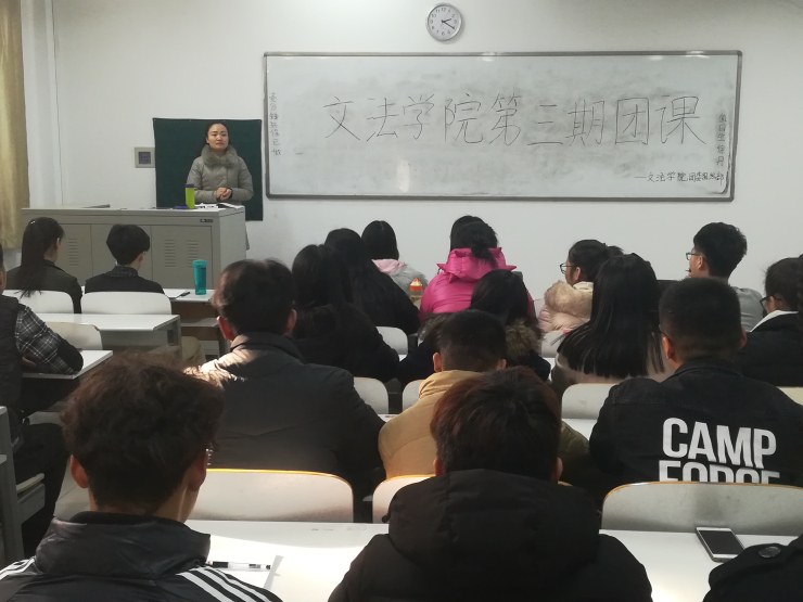 为深入学习贯彻党的十九大精神,提高团学干部的思想政治素质、政策理论水平、创新能力、实践能力和组织协调能力。11月30日下午2点20分,由文法学院团委组织部承办的第三期团校暨2017年青年马克思主义者培养工程培训班第六课于道镕楼402教室举行,本次团课由文法学院团委书记郑玲玲老师讲授,团委副书记张曼琪、王慧慧和本期团校全体学员参加。