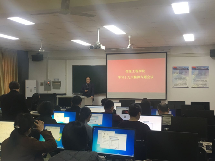 为进一步学习贯彻十九大报告精神,增强学习的针对性和实效性,响应学院的政治学习号召,2017年11月23日下午,信息工程学院全体教职工在资讯大楼118召开“学习十九大、评估我先行”的政治学习会议。会议伊始,全体教职工对习近平总书记在党的十九大开幕会上所作的报告——《决胜全面建成小康社会 夺取新时代中国特色社会主义伟大胜利》继续进行了深入的学习,对其中的新理念、新论断、新任务、新举措开展了热烈地交流和讨论。其后,会议针对《本科教学工作合格评估知识手册》各项评估指标体系做了统一把握和要求,并强调教职工在评建工作中要做到“学懂弄通做实”,认真做好评建相关的各项工作。