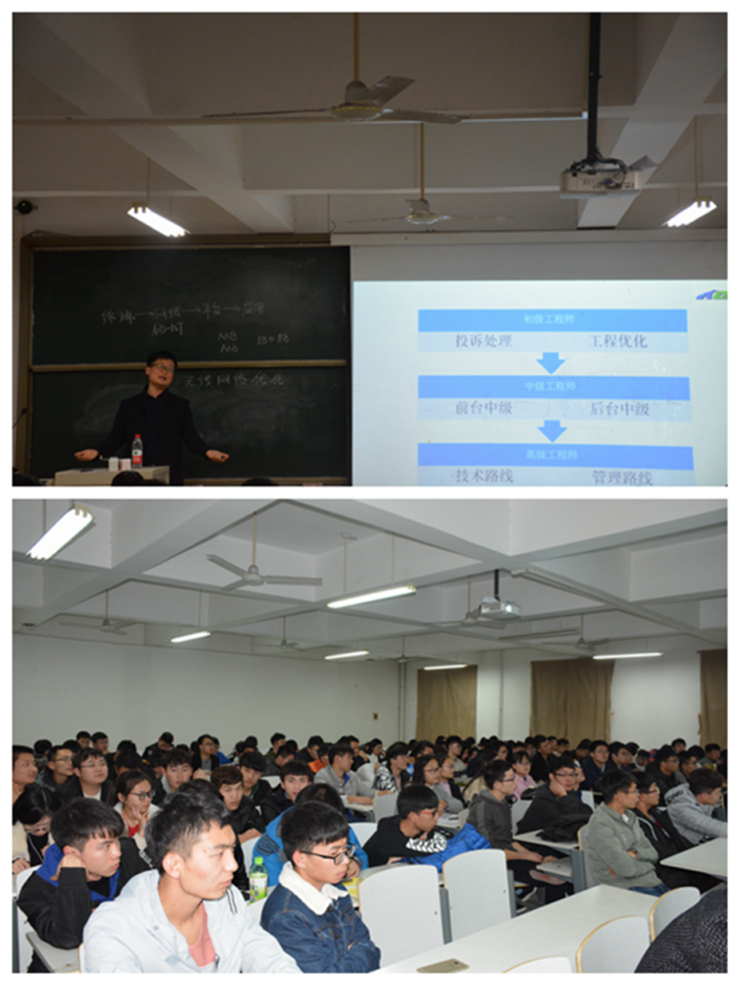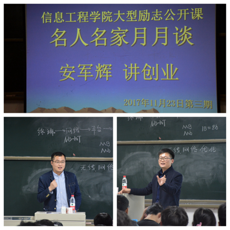 11月23日晚上7:00,信息工程学院大型励志公开课《名人名家月月谈》于资讯楼315顺利举行。本次公开课由河南讯轨通信科技公司创始人安军辉先生主讲,我院学生约200余人参加本次讲座。本次讲座由袁奉亚老师主持。
