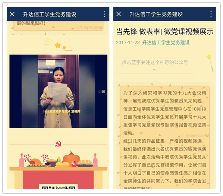 此次活动以“浅谈我所理解的十九大报告和《中国共产党章程(修订)》”为主题,向我院全体学生党员广泛征集“微党课视频”,并通过“升达信工党务建设”官方微信公众号统一推送公布。经我院学生党员悉心准备和用心录制,截止11月20日,学生党建管理中心共收到“微党课视频”共15余份。经精心挑选、优中选优,最终选出6份视频作为学习代表。所选视频内容多紧绕主题、切入重点,但学生授课风格各不相同,既存在诙谐幽默式授课风格,又有成熟稳重式授课风格。视频一经公众号推送,立刻引起我院学生广泛关注,取得效果显著。
