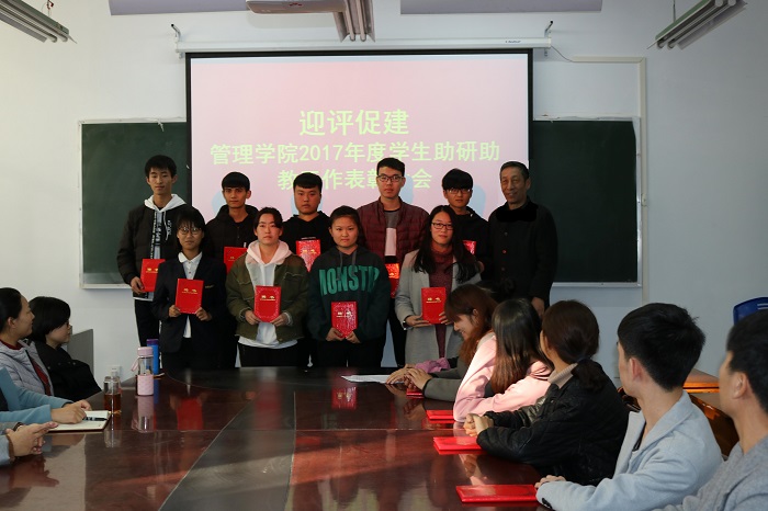 本次大会的主要是表彰助研助教工作中表现优秀的学生,同时聘用了一批新成员,表彰大会于11月23日在综合楼215会议室举行,管理学院院长纪德尚教授、副院长唐云、党委书记 张小雁和各教研室主任参与了此次表彰大会。