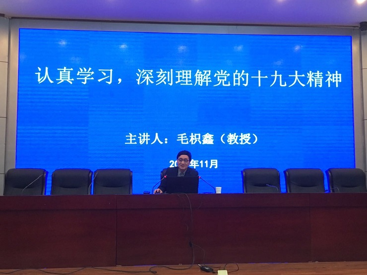 毛积鑫教授从三个方面对十九大精神做了深刻解读:1、十九大报告的基本框架和新时代的“六个新”。2、理解十九大报告的几点体会;3、贯彻十九大精神的几点思考。在报告会上,毛教授认为,理解十九大报告要把纲领提出来,把厚书读薄。接下来,毛教授从三个板块论述了十九大报告的主题形势、具体部署;通过对新中国成立以来的三个阶段的划分来谈不同领导人的性格魅力及时代特;从社会转型的大背景来理解十九大提出报告的深刻内涵;结合学校实际,毛教授认为,学校要把价值塑造放在首位、教师要思考学生的需要,培养知荣辱、守规矩、懂感恩、能干事的新时代大学生。毛教授注重理论联系实际和哲学辩证思维方式,带给大家很多启发。