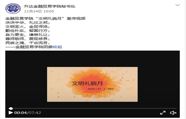 金贸学院团委秘书处全体成员于2017年11月11日开始在升达图书馆、明德讲坛、教学三号楼以及各学生宿舍楼等地点,以随机采访学生的形式录制了文明礼貌月宣传普及视频。采访视频以“你对文明礼貌月有多少了解”、“本次文明礼貌月主题是什么”、“你与老师之间发生过哪些令你难忘的小故事”等等问题为主。其中采访对象有升达学子、我校国旗班成员、团学会成员、主席团以及我院领导、老师等。
