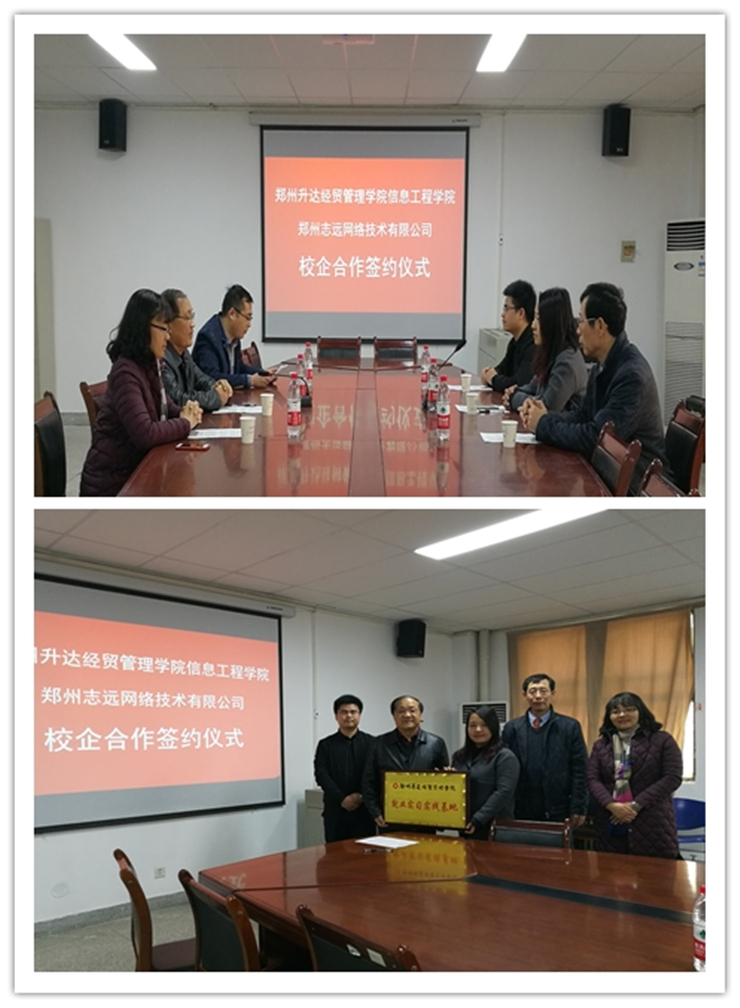 签约仪式在资讯楼104会议室举行。信工学院院长李学桥教授、党总支王新平书记,郑州志远网络科技有限公司副总经理范宝珠女士、总监王向南先生、院校合作部鲁长波经理出席了此次签约仪式,仪式由信工学院就业专员袁奉亚主持。
