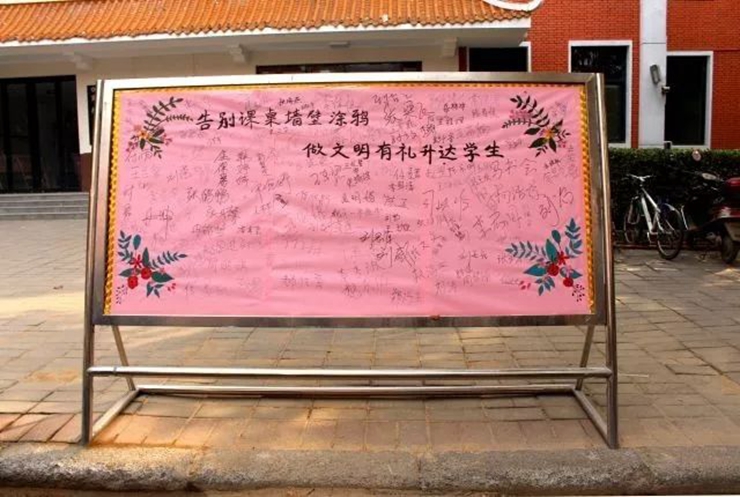 活动开始,同学们纷纷赶来,积极参与签名活动。相应于此,各个班级在教室里也积极开展了“告别课桌涂鸦”的活动,每位同学都快速行动了起来,课桌上的涂鸦在一点点减少,教室干净了,每个人都在为创造干净而舒适的学习环境奉献了一份力量。我们都应该很明确:一个干净的生活环境、学习环境,对于我们来说是很重要的,同时也要自觉清理课桌污垢,自律自己乱涂乱画。大家要相互监督,防微杜渐,从点滴做起,从身边小事做起,共同创造文明校园。