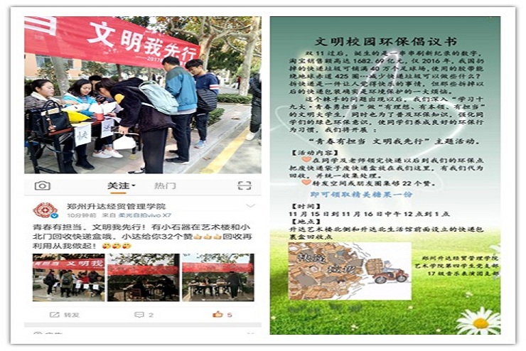 本次活动针对“双十一”后出现大量包裹垃圾,对校园环境造成污染,对校园环境清洁造成压力的情况,帮助同学们了解环保的重要性以及包裹盒子和包裹包装袋子再回收过程,鼓励大家积极响应,参与活动。主题活动于11月15日-11月16日在艺术楼门口和20号楼门口开展。