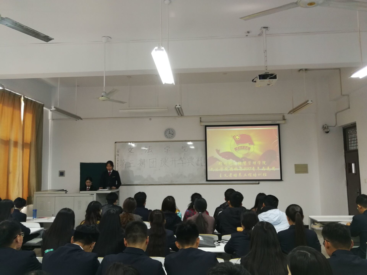 此次活动由培训班班主任王佩艺主持,在庄严的共青团团歌中,开学典礼正式开始。首先,由团委组织部副部长韩江源介绍了此次团校意义及今后的课程安排。接着,17级新生团校学员代表朱莉娜同学上台发言,她代表团校学员庄重承诺将严格要求自己,努力做一名优秀共青团员。随后,由团委副书记张曼琪为本次典礼致辞。她重温了团的历史,阐明上团课的真正目的,要求同学要端正入团动机,树立正确目标,积极学习贯彻十九大精神;希望大家充分发挥团员的先锋模范作用,不仅在思想上要积极向共青团组织靠拢,更要在行动上有所表现,做一名有理想,敢担当,不保守,肯付出的优秀共青团员。最后,由文法学院第三期团校班主任王佩艺宣布团校纪律及规章制度并选定班委成员。