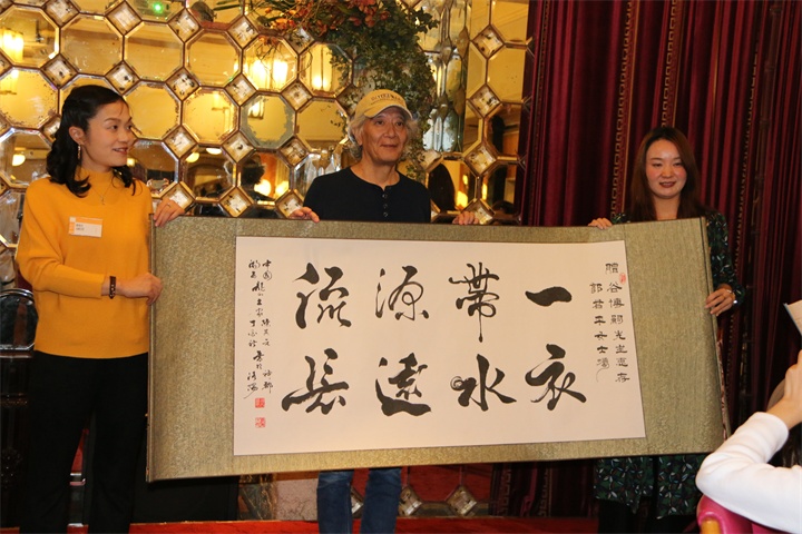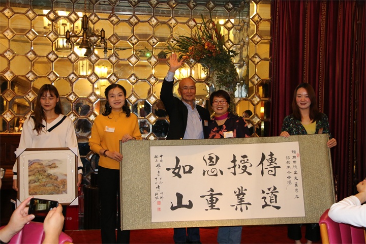 聚会最后,校友组委会向三位特意赶来的日本外教赠送纪念品,纪念品各有两种,一种是由组委会统一购置的框画,一种是主持人郭君平同学的父亲托书法家朋友特意为三位外教书写的书法作品,三位外教深深为之感动。