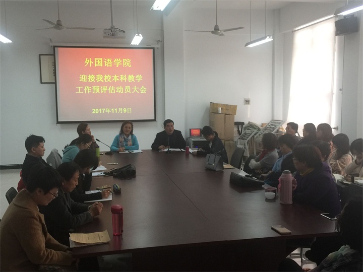 11月9日下午,在结束了我校思源会馆召开的迎接教育部本科教学工作合格评估倒计时暨预评估工作部署动员会之后,外国语学院立即在学院会议室召开了全院预评估动员大会,外国语学院院长张梦教授,党总支书记石号召同志,副院长崔瑾英副教授,教学秘书王粲,行政秘书惠凯赟及全体教职员参加了本次会议,会议由院长张梦教授主持。