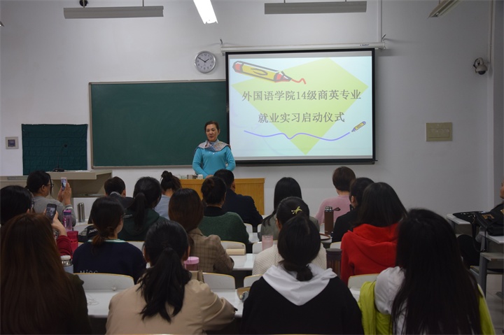 11月8日下午,外国语学院举行商务英语就业实习活动启动仪式。出席此次活动的有外语学院院长张梦教授,党总支书记石皓召同志,副院长崔瑾英教授,河南中跃达电子商务有限公司邓予晶总经理以及14级商务英语专业的全体同学。
