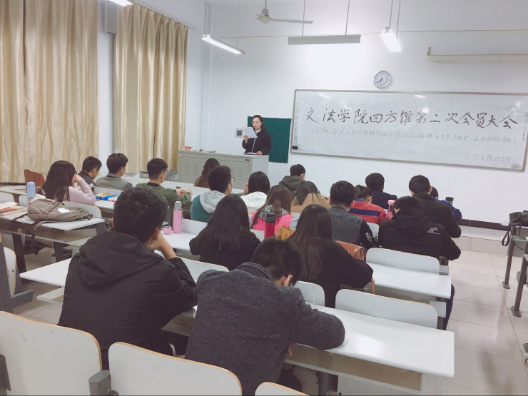 为深入开展“学习十九大,青春勇担当”活力团支部创建活动,规范团学活动的开展,增强同学们之间的交流,更好的开展读书活动,11月15日晚6:30,文法学院四方馆读书会在道镕楼410举行第二次会员大会。出席本次大会的嘉宾有:文法学院四方馆读书会顾问张明奇老师,校梦盈文学社、校模拟法庭、文法学院主席团部分成员。