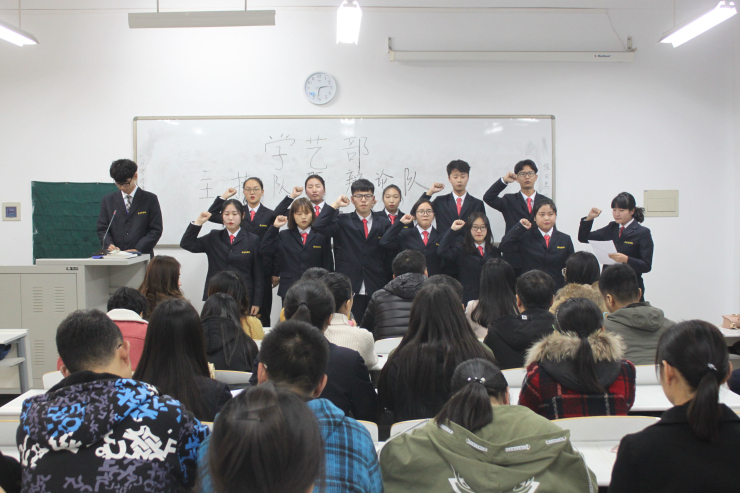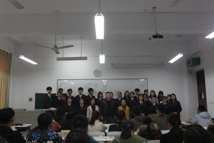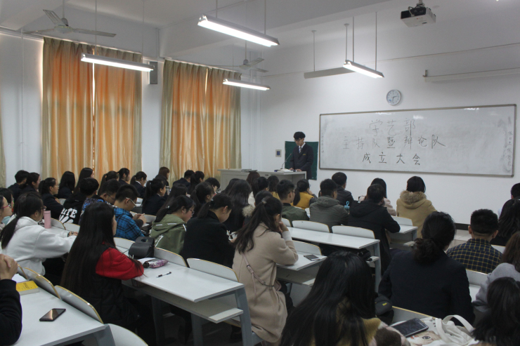 文蕴千秋浩气,法济万世民生。为深入开展“学习十九大,青春勇担当”活力团支部创建活动,提高同学们的辩论语言技巧,挖掘有潜力的队员,为我校提供优秀人才,11月16日中午12点20分,由文法学院学艺部承办的新一届辩论队和主持队成立大会在道镕楼321教室举行。出席本次大会的嘉宾有:文法学院团委副书记彭凯老师,17级辅导员王卫丽老师、王松洁老师,第15届学艺部部长丁依伦、副部长叶焕燃,第15届辩论队队长王逸飞,副队长谢倩、孔云威,第15届主持队队长朱奎,第16届团委学生会主席团成员。