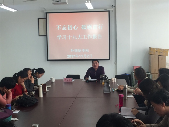 11月2日下午3点30分,外国语学院在时金楼512召开会议,组织全体教职工学习习近平总书记十九大工作报告。学习由外国语学院石皓召书记主持,外国语学院全体教职工参加了本次会议。