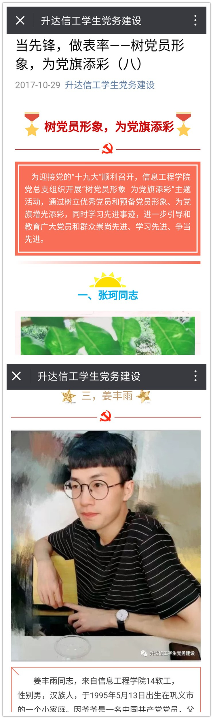 截至10月29日,该活动圆满落下帷幕。活动中,我院采取“升达信工学生党务建设”微信公众号文案推送形式,来展示各党员风采,先后共推送8期文案,每期文案包括3名学生党员基本信息,累计展示共计24名学生党员风采。其中,文案中详细地展示了各党员思想、生活、学习、工作等方面的进步和感悟。活动一经启动,立刻引起我院学生广泛关注。活动结束后,学生们纷纷表示将以我院学生党员为榜样,立足自身,全面发展。