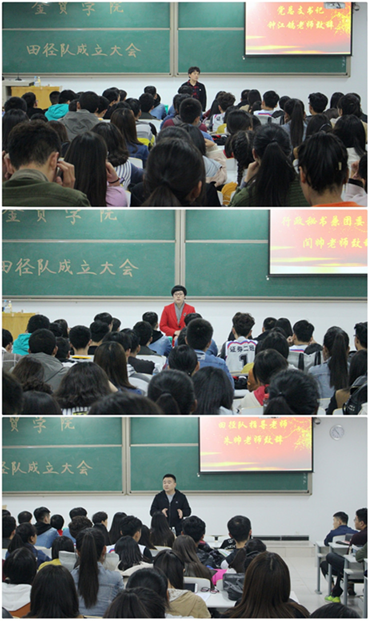 2017年10月25日下午4时40分,我院于时金楼115教室召开了金贸学院第二十一届田径队成立大会。出席大会的嘉宾分别是:金融贸易学院党总支书记钟江鸽老师、金融贸易学院行政秘书兼团委书记闫帅老师、金融贸易学院田径队指导老师兼17级新生辅导员朱帅老师、17级新生辅导员常单单老师、苏浩老师、徐依凡老师、第二十三届团委副书记李征宇、学生会主席李浩天、学生会副主席李宏润、郭晓阳、李丽娜、社联理事长白嘉伟以及各部门部长。