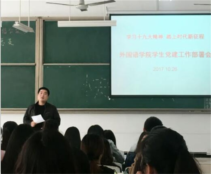 10月26日下午一点,在时金楼107室,外国语学院党总支召开了我院学生党建工作部署会。院党总支书记石皓召同志、院行政秘书兼总支纪检委员惠凯赟老师、院党总支组织委员王娟老师、我院全体辅导员及全体学生党员、培养对象和新一期党校学员参加了本次会议。
