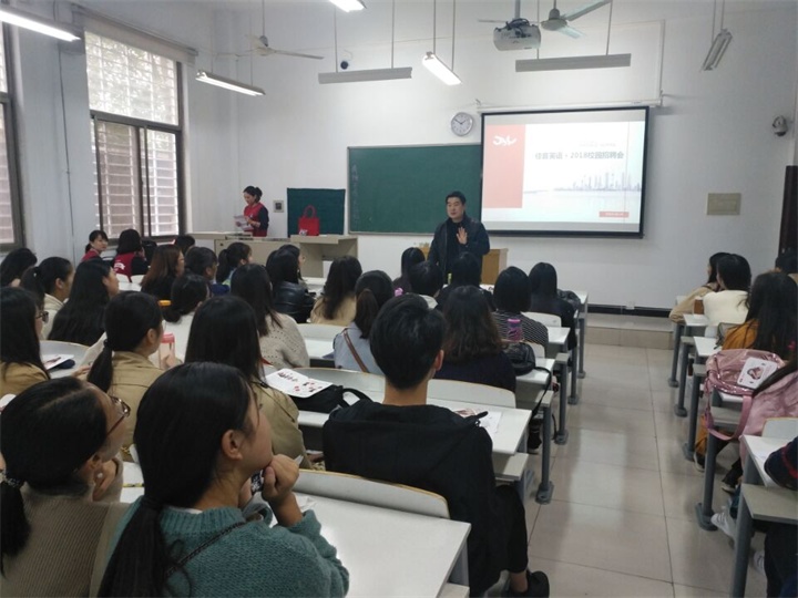 10月25号下午,在时金楼103教室,外国语学院2018届毕业生首场宣讲招聘工作顺利举行。宣讲当天,共有来自上海、北京、郑州、洛阳、义务等地的五家英语培训机构及两家外贸企业参与宣讲,共提供就业岗位109个,全部为与我院专业对口的教师和外贸岗位。