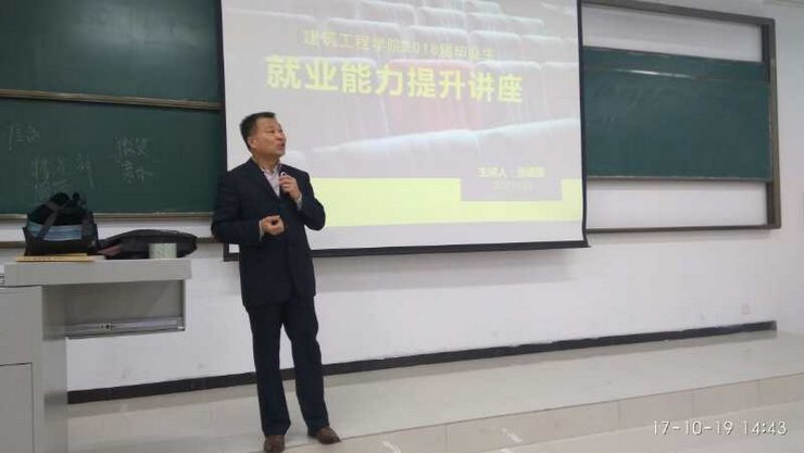2017年10月19日下午2点,建工学院在实训楼608教室举办2018届毕业生就业能力提升讲座。出席本次讲座的嘉宾有建工学院韩炎涛书记、建工学院双创办公室负责人张建国老师以及毕业班部分辅导员。