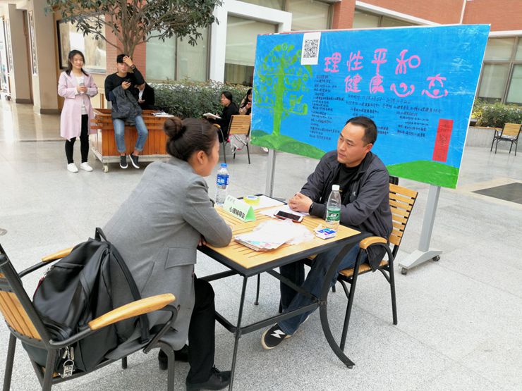 活动伊始,同学们陆陆续续的进入大厅,有序排队签到,用手机浏览器扫二维码进入心理健康测评知识竞赛,然后让同学们参观心理健康知识展板展示、心理图片展。接下来,由我校特邀的心理咨询师以及各学院的心理辅导站站长,开展现场心理咨询活动。心理咨询师和同学们一对一咨询,现场气氛活跃,同学们积极提问,老师们耐心为同学们解答。最后,学生们通过和老师的现场交流,找到了可调节的方法,让他们能够更快的走出困扰。