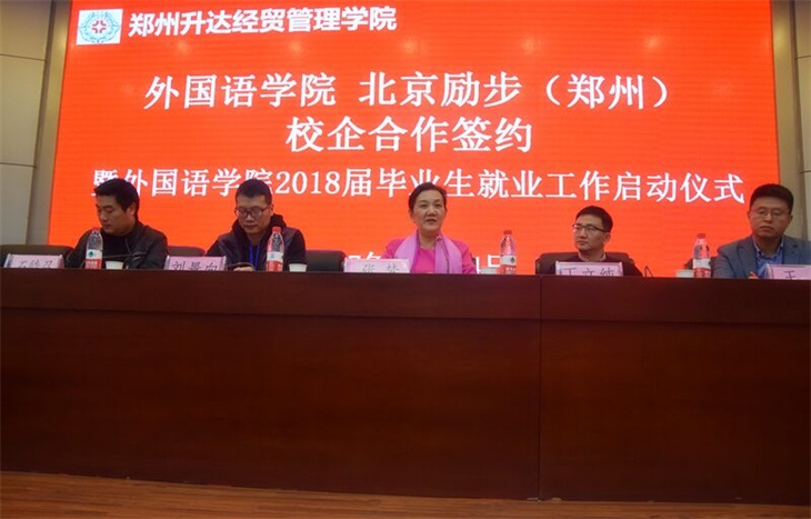 10月24日下午,外语学院与北京励步英语校企合作签约暨外语学院2018届毕业生就业工作启动仪式在国际会议厅顺利举行。学院招生就业处刘景向处长、外语学院院长张梦教授、学院党总支书记石皓召同志、北京励步英语全国运营总监丁立纯先生、北京励步英语郑州区运营总监王化先生,以及外语学院2018届毕业生参加了此次活动。