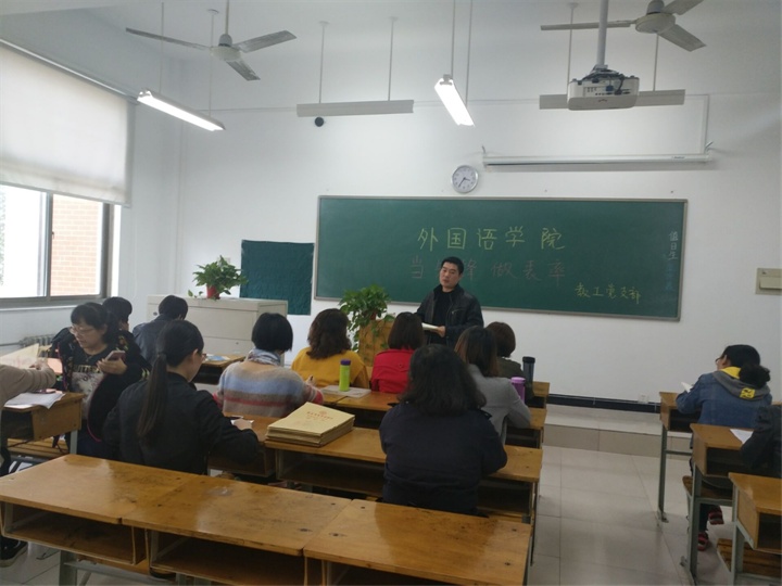 为了迎接十九大的胜利召开,把“当先锋、做表率”主题活动落到实处,为学校迎评促建再立新功,10月16日中午,外国语系教工党支部在时金楼502教室举行了“喜迎十九大、党先锋做表率”主题生活会。教工党支部全体党员参加了此次生活会。生活会由党支部书记白光主持。
