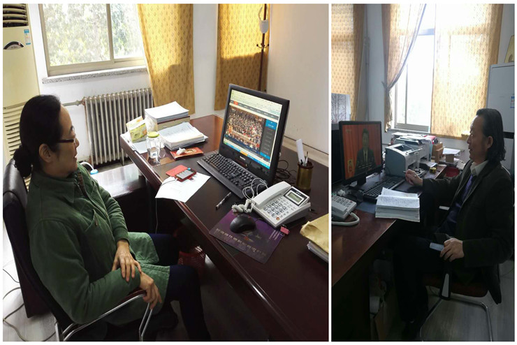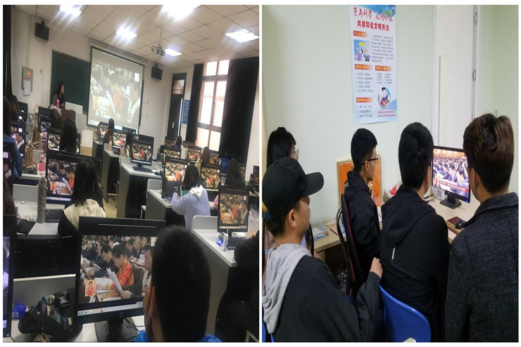 艺术学院李惠莉院长、赵维平副院长分别在自己的办公室观看了网络直播。部分无课同学在多媒体教室、教师在琴房和教研室、辅导员老师在办公室、学生干部在会议室都分别收看了开幕式直播。