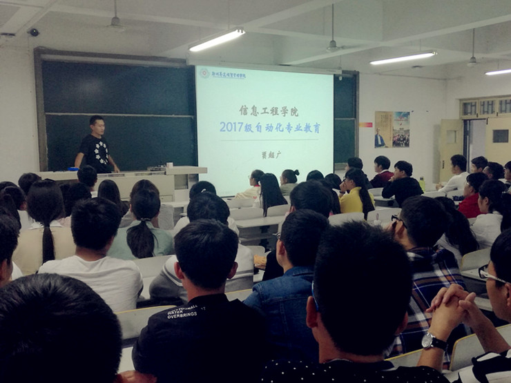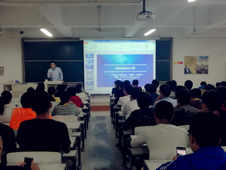 首先,崔老师向同学们简短介绍了计算机的发展历程、当今计算机的发展形势及日后计算机的就业前景。他说,现如今工业4.0和互联网+时代,同学们都是潜力股,只要同学们扎实肯学,都可高新就业,并且崔老师向同学们讲了当今计算机专业非常炫酷的种种小技能。接着,两位新生班主任对什么是自动化专业、自动化专业应用领域、自动化专业知识结构、自动化专业相关竞赛及自动化专业就业前景等五大问题,进行逐一解读。自动化1班班主任吕丽平老师指出,学好自动化专业需着重掌握控制理论、电气工程、计算机科学与技术基本理论;大一打牢基础课功底,大二培养专业课兴趣,大三着重考证、竞赛,大四规划就业、考研。同学们应做到循序渐进、步步为营、稳扎稳打、合理规划。自动化2班班主任贾超广老师提到,自动化专业最大特色便是人工智能,自动化办公、自动化生产、智能小区、机器人制造将在不久后普遍化,自动化专业就业前景十分可观,同学们要本专业充满信心。