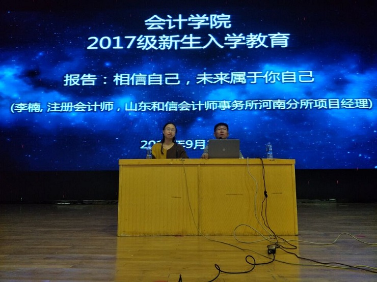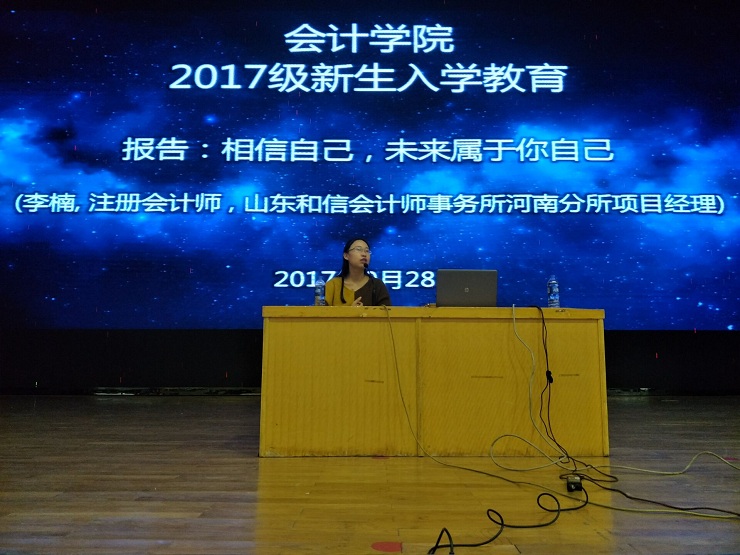 为使刚入校的小石器们能够更快的适应大学的生活,在自由轻松地学习氛围里找准自己的方向。会计学院有幸邀请到我院优秀校友、注册会计师、山东和信会计师事务所河南分所项目经理李楠女士,于9月28日上午8::30在思源会馆为会计学院17级新生做关于“相信自己,未来属于你自己”的报告。出席本次活动的嘉宾有:会计学院行政秘书兼团委书记陈刚老师、全体17级新生班辅导员老师。