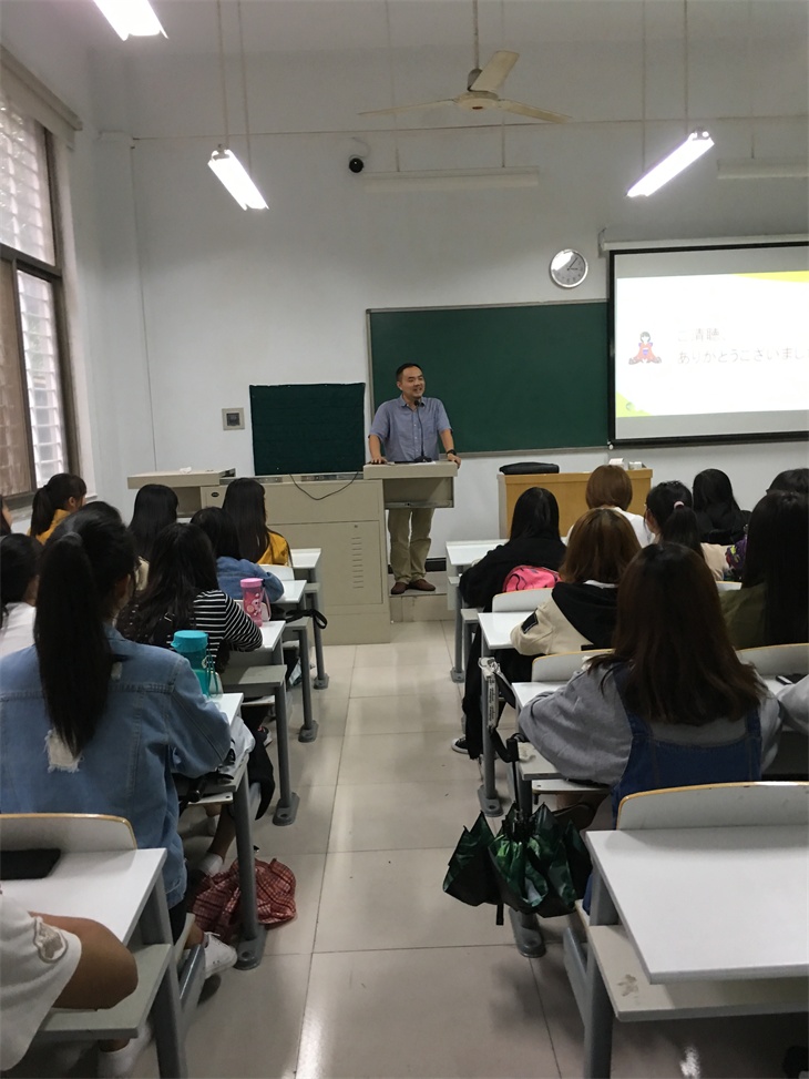 随后,赵宏涛老师以交谈的形式向同学们介绍了自己学习日语的初衷,以及留学日本的种种经历,风趣幽默的语言和真实的人生体验让同学们对日本这个国家以及日本社会有了更深入的了解,激起了他们学好日语的决心。