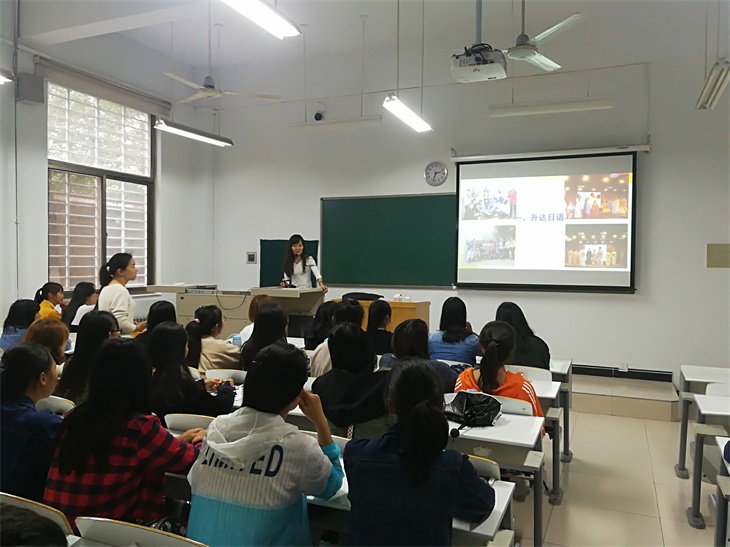 紧接着,洪艳荣老师用“是否能学好日语”和“日语专业将来的就业优势”两个主题引发了同学们的共鸣。洪老师以刚刚结束的首届全国高校大学日语演讲比赛和毕业生的工作情况为例,向同学们介绍了日语学习的各种途径和方法,以及日语专业的就业优势,让他们树立了学好日语的信心。