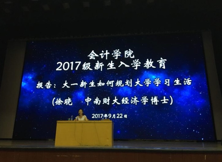 为使新生尽快熟悉大学生活,合理规划学习,明确学习目标,会计学院有幸邀请到优秀毕业校友徐晓和周琳博士在思源会馆为会计学院17级新生分别做了关于“大一新生如何规划大学学习生活”和“管理会计——领先一步 优秀一生”的新生入学教育。参加本次会议的有:会计学院行政秘书兼团委书记陈刚老师、会计学院行政秘书刘锦老师、17级新生班辅导员以及会计学院700余名新生。