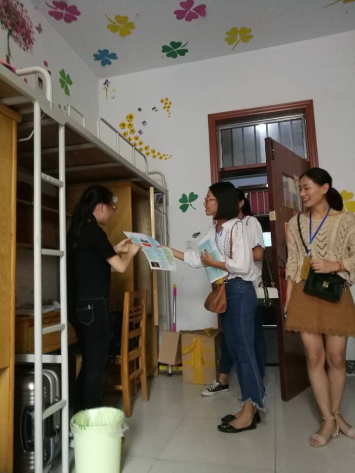 与此同时,党员服务队按照课程情况不同,组成了若干小组,在上午、下午和晚上的时段深入到“小石器”们的宿舍楼。给他(她)们提供贴心的指导和服务。党员服务队的同学拿着学校和外国语学院分别制作的宣传手册在新生宿舍里向大家宣传防盗防骗、反邪教的知识,同他(她)们交流大学的生活学习心得,告诉他(她)们如何规划好自己的学习和生活。这些关心和照顾,让新生同学们从心底里产生了对这些党员学长的信任,他们把宣传页贴在门上和墙上,时刻提醒自己保持警惕,牢固树立安全防范意识。