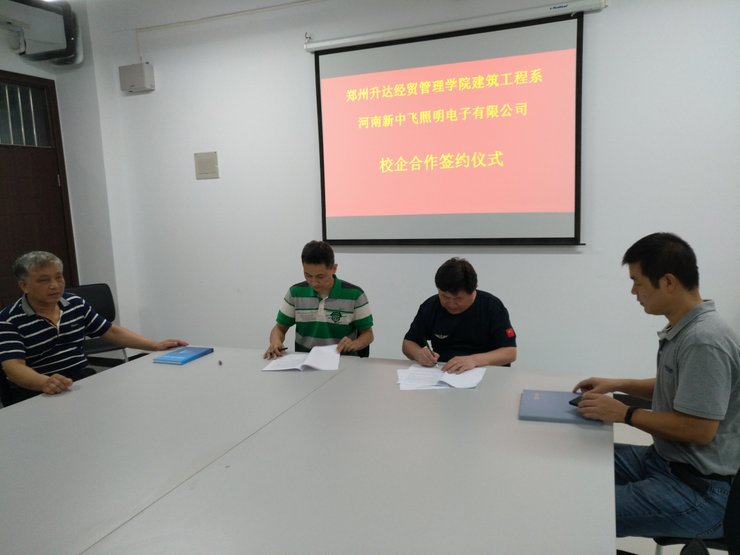 经联系洽谈,我系与河南新中飞照明电子有限公司达成校企合作意向。8月2日上午,在我院实训大楼324会议室,建工系王国际主任与河南新中飞照明电子有限公司代表郑志勇先生签订了产学研合作项目协议。建工系体育系党总支书记韩炎涛同志、建工系孙建超副主任和部分教师代表出席签约仪式。