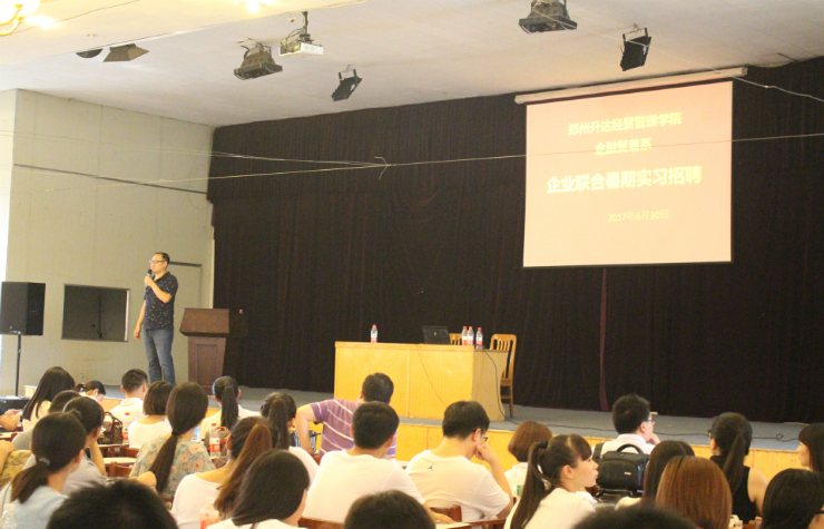 为了深化学生对行业的认知理解,提升专业技能及实践操作能力,服务于应用型人才的培养目标,金融贸易系根据所开设专业情况,大力开展实习实训及就业基地建设, 为学生提供专业实习的平台。经过前期实地考察及精心筛选,金融贸易系联系5家相关企业,于2017年6月30日下午在龙湖报告厅,针对2014级本科生展开暑期专业实习企业联合宣讲招聘活动。