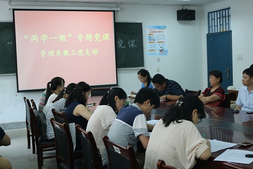 贯彻学院党委关于讲好“两学一做”学习教育专题党课的通知精神, 管理系教工党支部于2017年7月6日下午在教学2-205进行了专题党课学习活动。参加本次学习活动的有管理系教工党支部的全体党员老师。