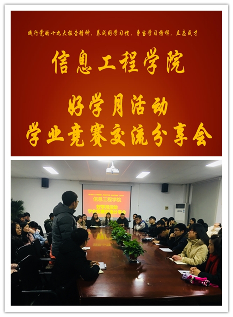 为践行党的十九大报告精神,养成好学习惯,争当学习榜样,立志成才。1月4日晚于资讯楼104会议室开展我院“好学月”系列活动之学业、竞赛交流分享会。特邀15级竞赛代表张鹤、申政杰;16级学业代表卢露、王攀等优秀学长学姐来此为学弟学妹们分享交流学习、竞赛经验。