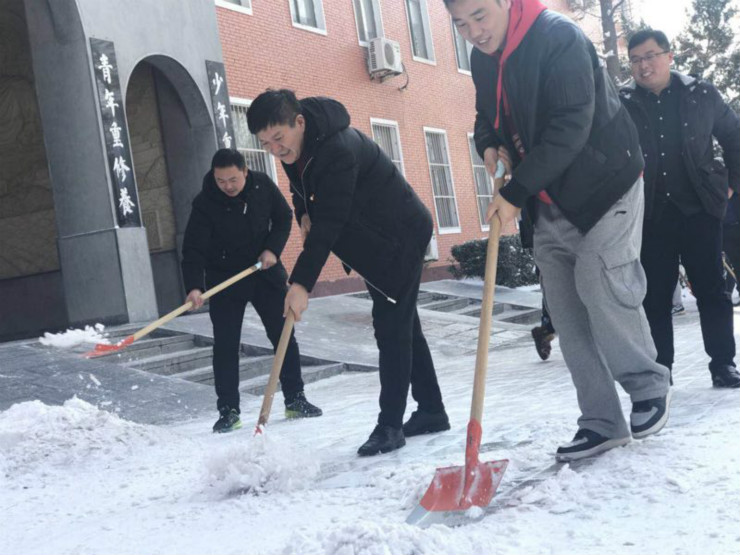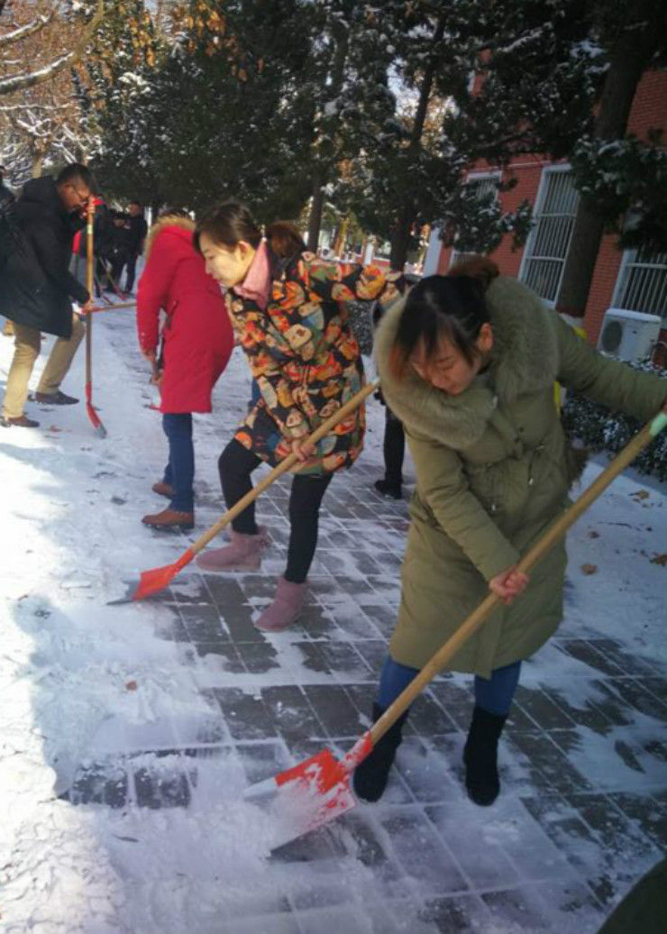 2018年1月5日上午11点左右,会计学院组织全院辅导员以及部分团学的同学开展扫雪除冰活动,会计学院党总支张红阳书记亲自对全院辅导员进行动员,并与行政秘书兼团委书记陈刚老师、刘锦老师带领大家一起领取工具,铲除积雪。张红阳书记不畏严寒,率先开始投入活动,会计系行政秘书兼团委书记陈刚老师、行政秘书刘锦老师也迅速组织大家分发工具、划分区域,老师们看到此情此景,纷纷表示不甘落后,积极投入清理积雪工作,场面热火朝天。