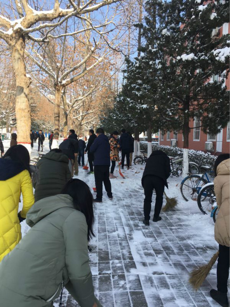 大家辛苦的清理着已经略有上冻的积雪,入耳的都是铲子与坚硬的冰碴碰撞的声音。经过一个多小时的辛苦努力,清理工作基本结束。道路积雪已经被清除干净,会计学院辅导员以及学生用自己辛勤的汗水为师生们清理出了一条干净、安全的“康庄大道”。